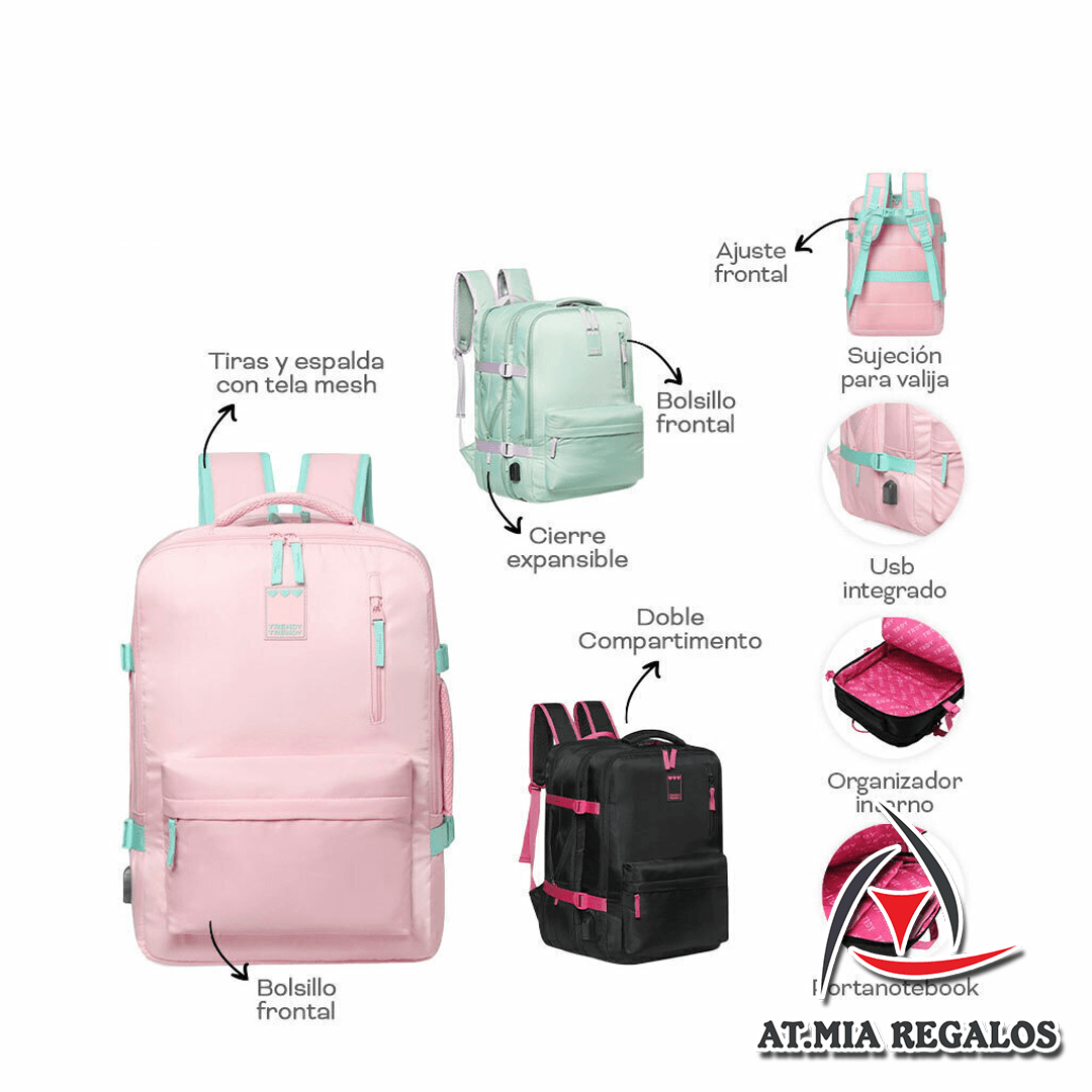El modelo incluye puerto Usb, interior térmico, triple apertura, sujetador para valija a frente y lateral, cierre expansible, portanotebook, espalda y tiras mesh, bolsillo frontal, bolsillo antirrobo, espacio botinero separado y organizador interno.
