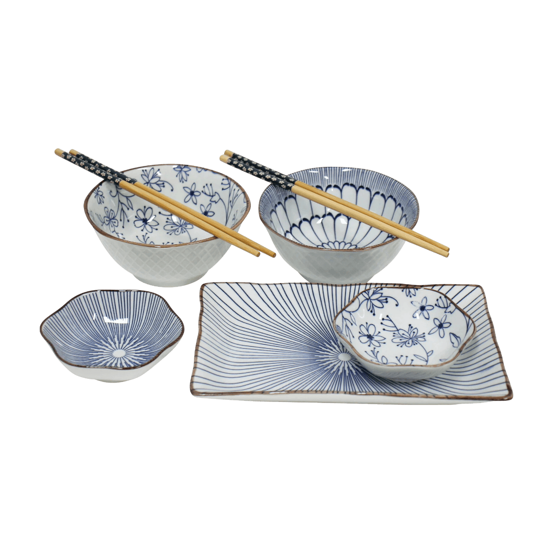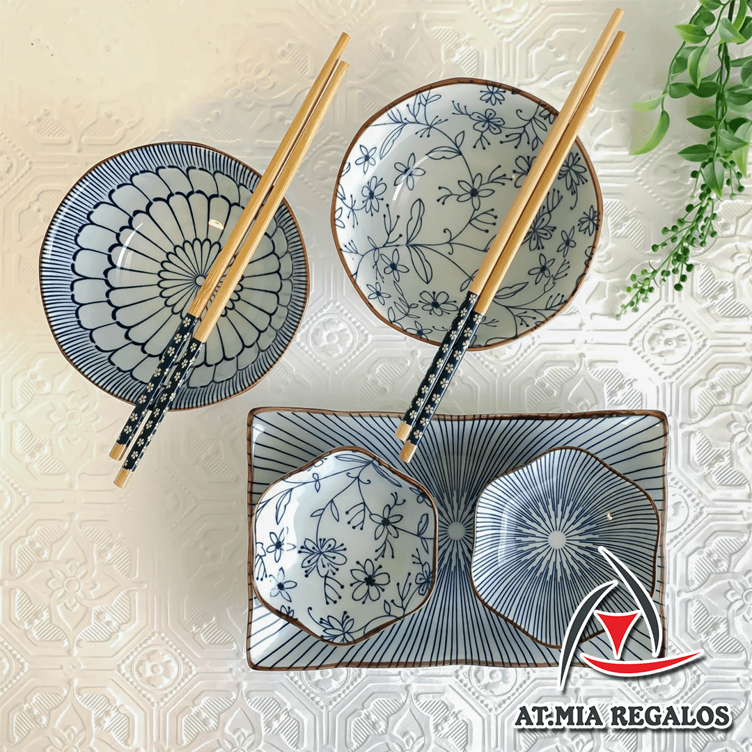 Set de Sushi Cerámica Premium Estilo Japonés Blanco y Azul x6