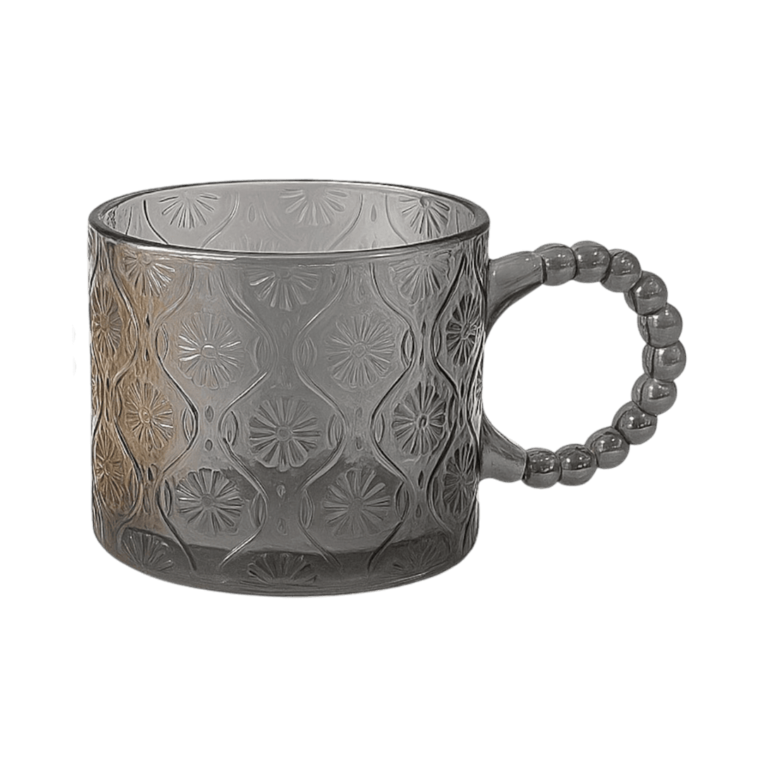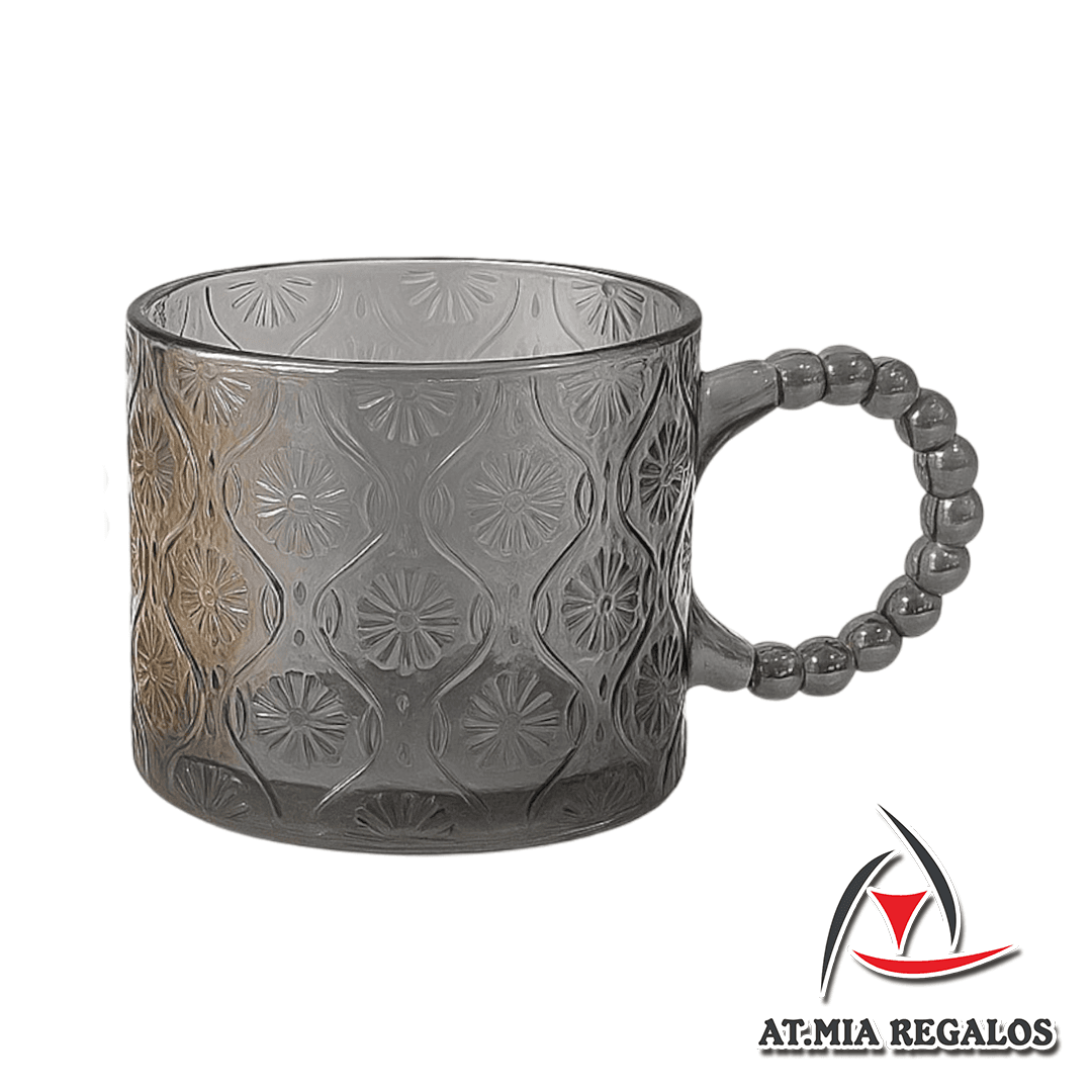 Set x6 Tazas de Vidrio C/Manija Circular Diseño Flores Gris 320ml