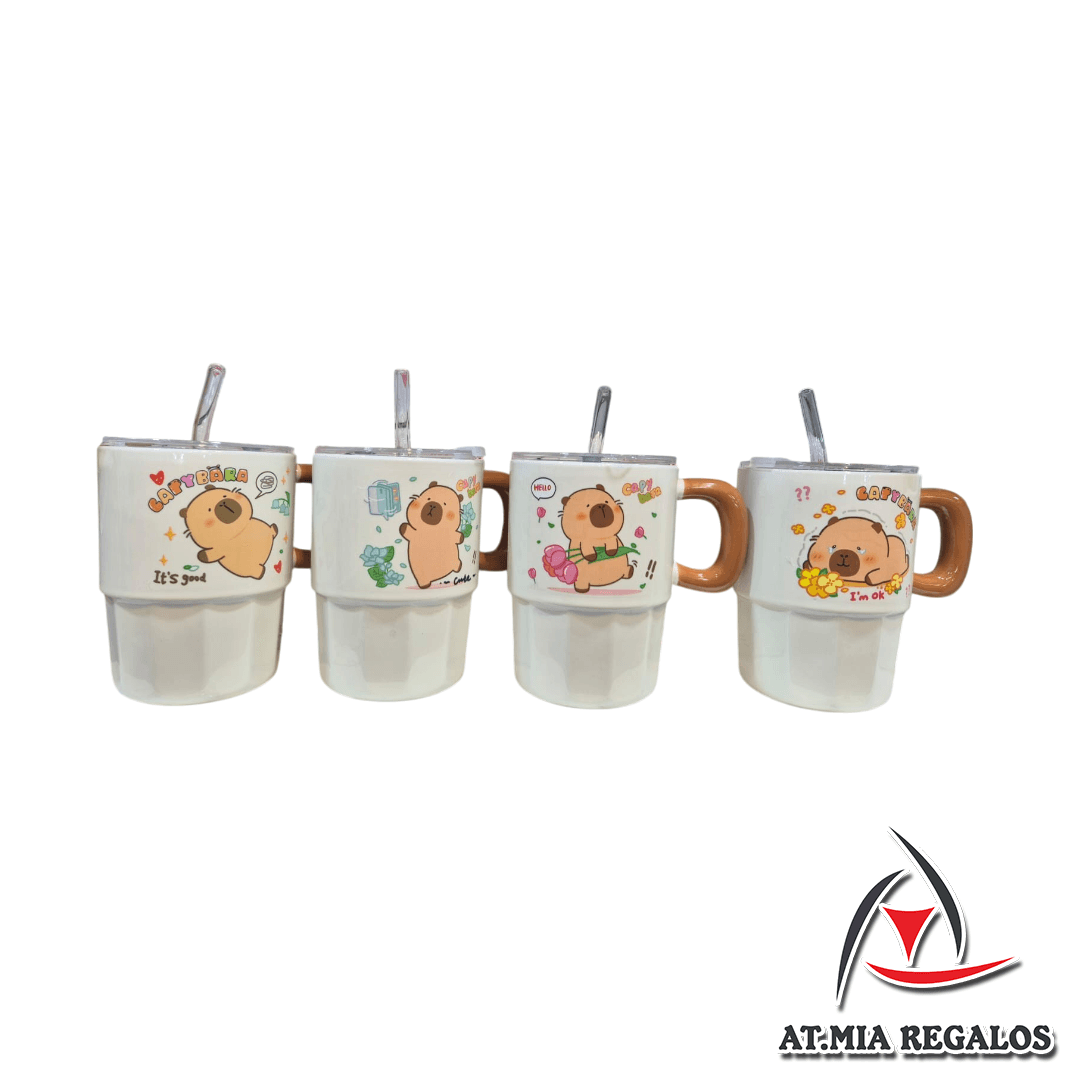 Taza de Cerámica Con Tapa + Sorbete Diseño Capibara 480ml