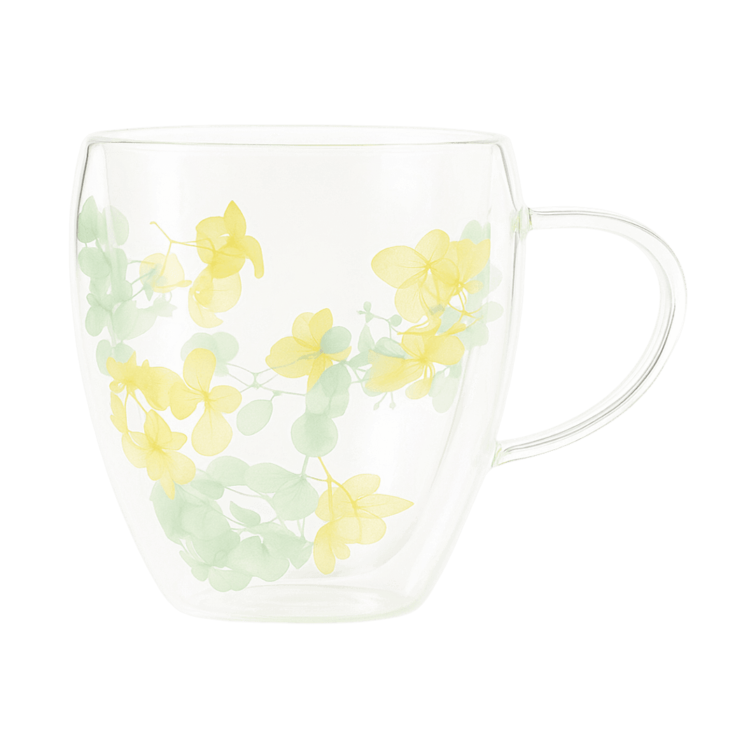 Taza de Doble Vidrio Diseño de Flores Amarillas y Verdes 250ml