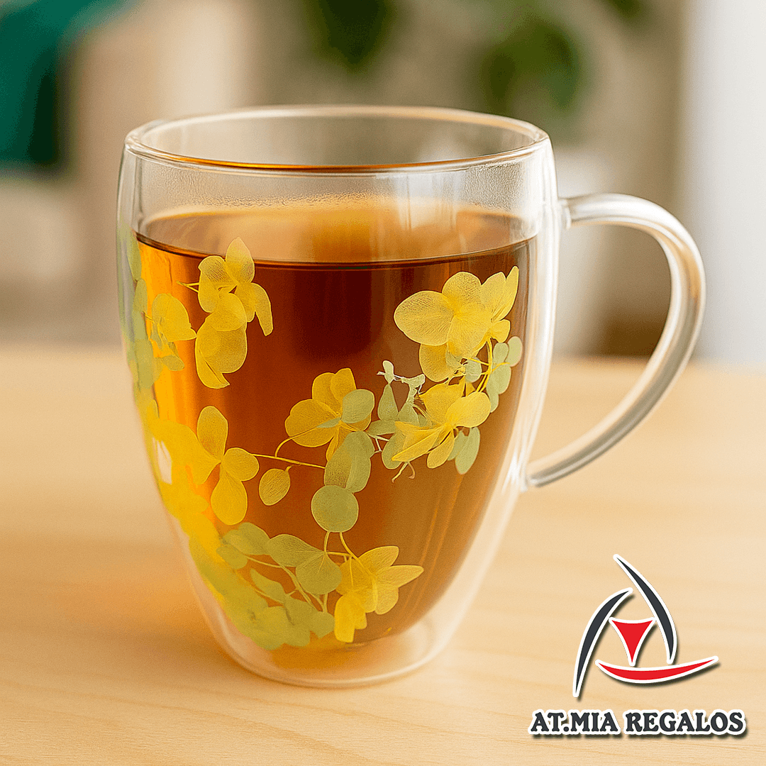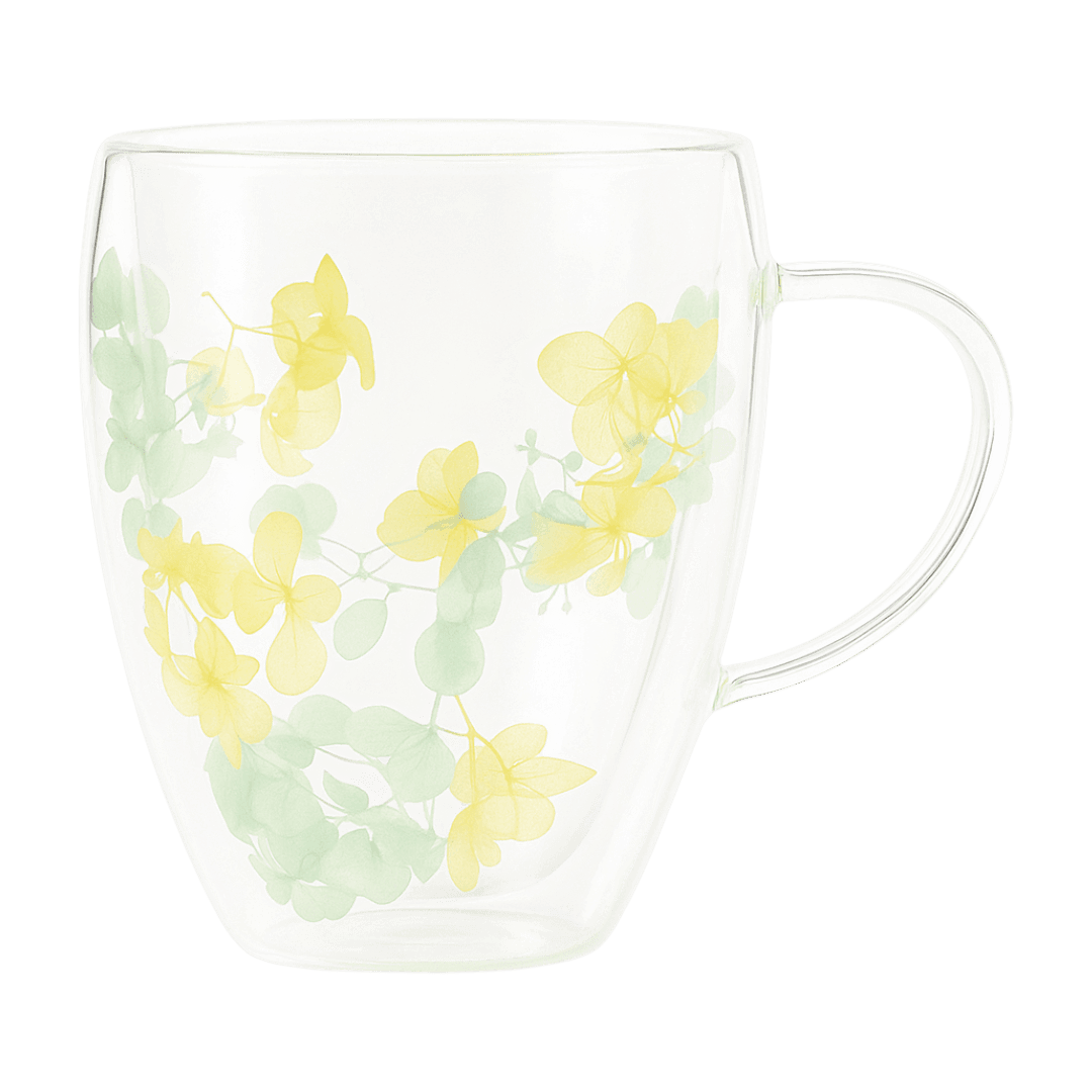Taza de Doble Vidrio Diseño de Flores Amarillas y Verdes c/Asa 350ml