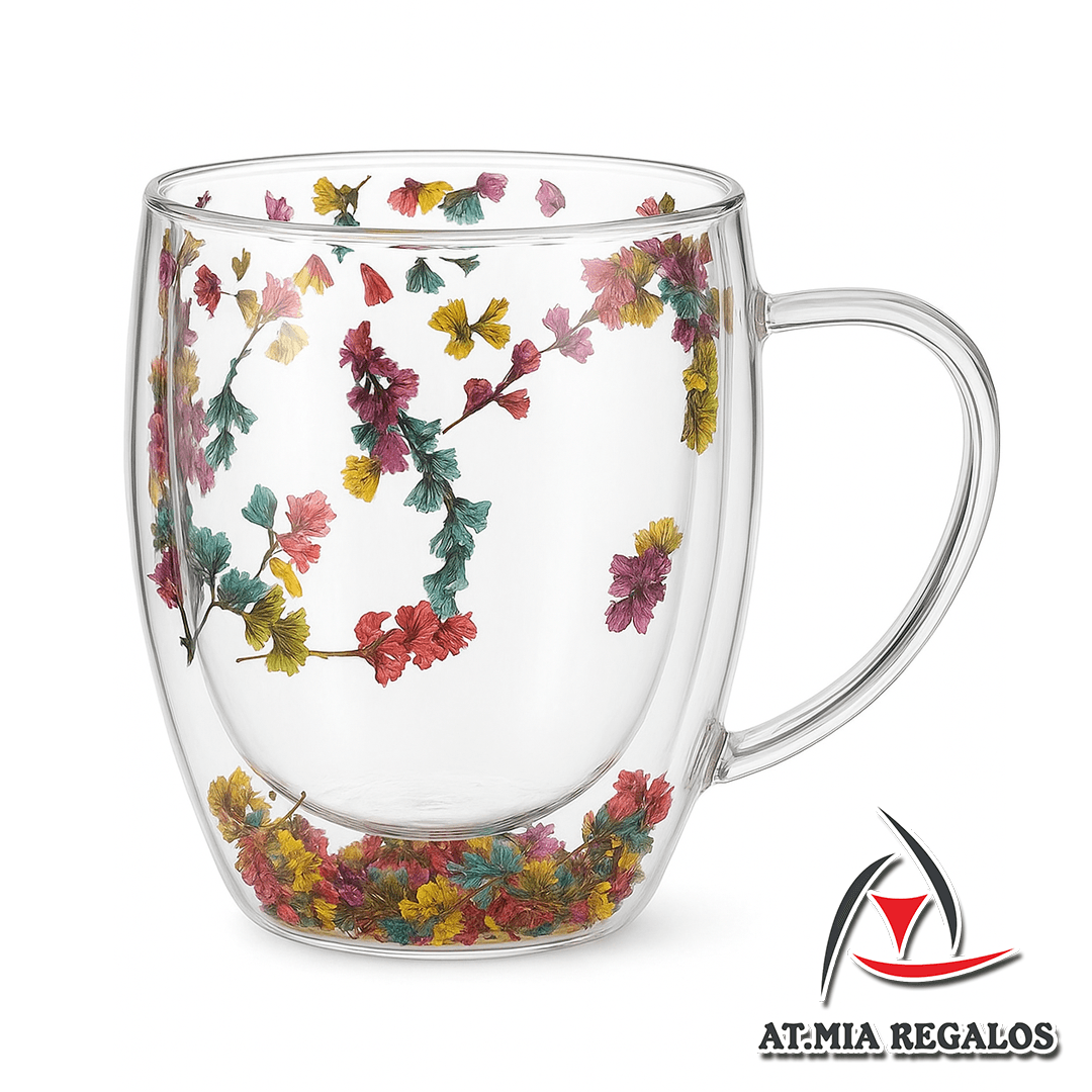Taza de Doble Vidrio Diseño de Flores Multicolores c/Asa 250ml
