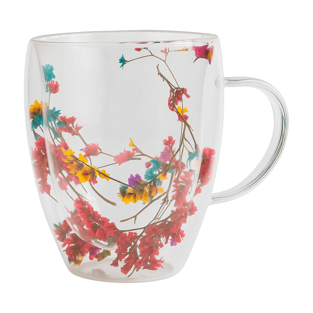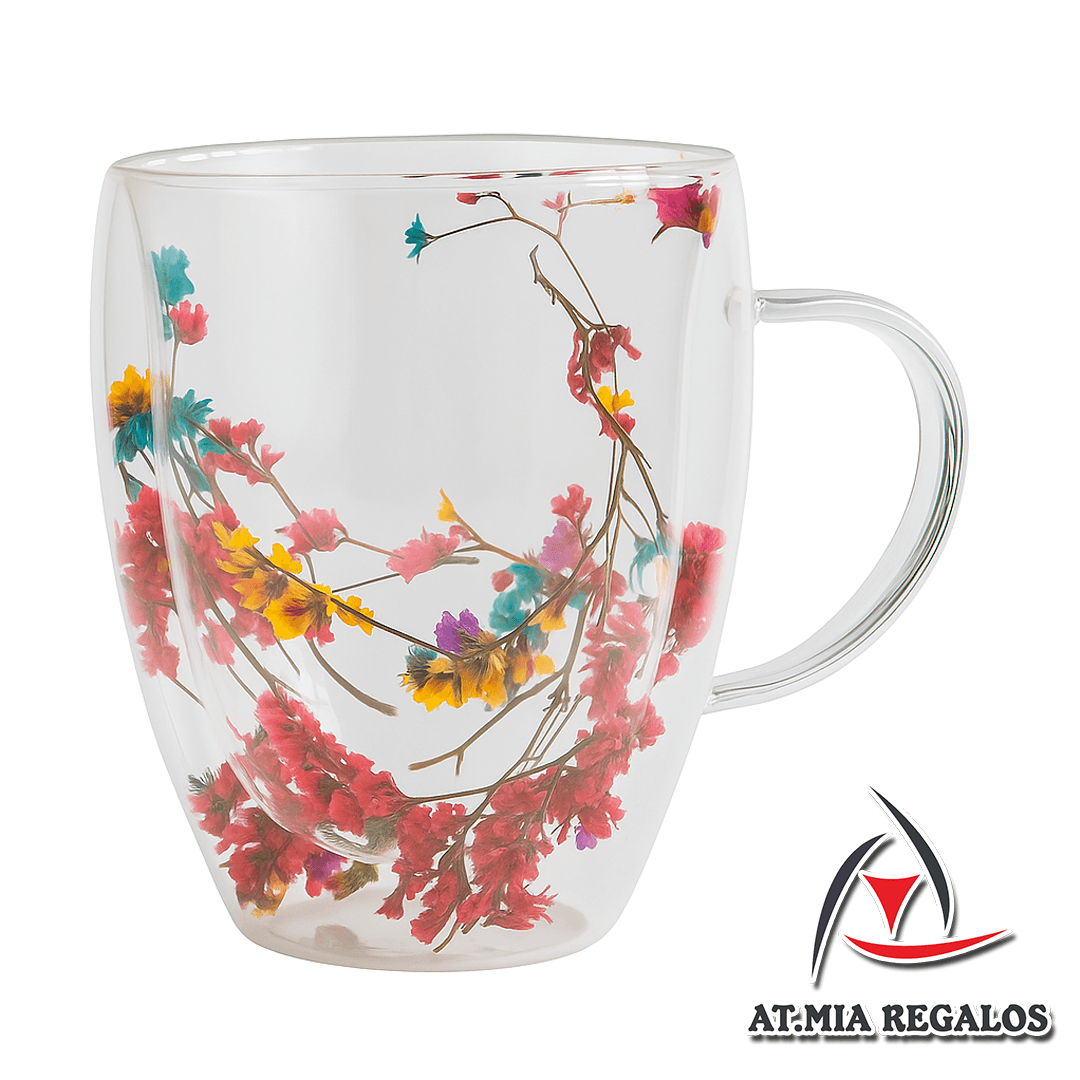 Taza de Doble Vidrio Diseño de Flores Multicolores c/Asa 350ml