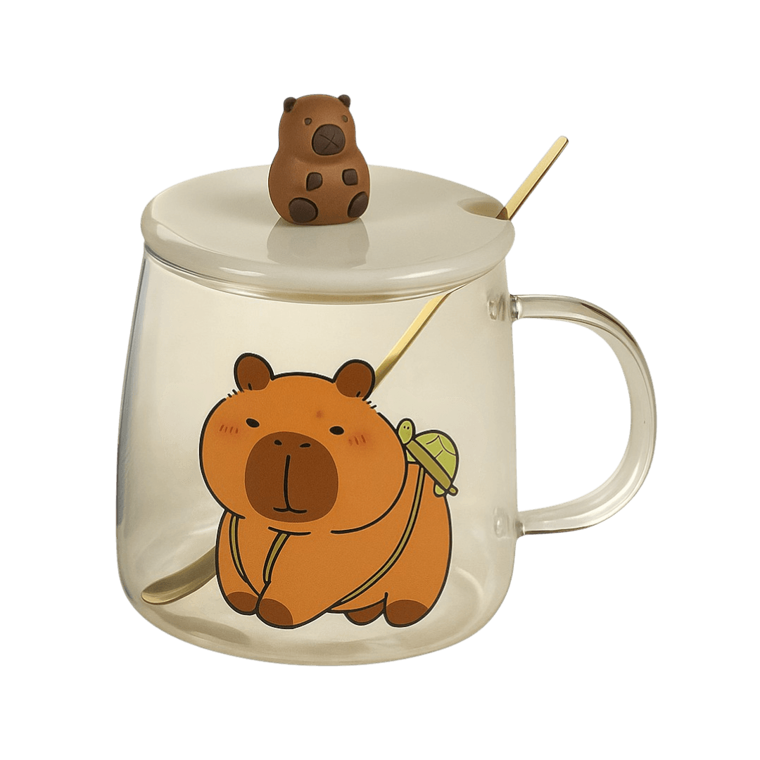 Taza de Vidrio Con Tapa + Cuchara Diseño Capibara 450ml